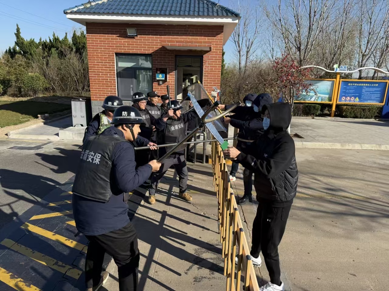 本次演練模擬了三名恐怖嫌疑人攜帶管制刀具強(qiáng)行闖入第一平原水庫、惠澤水廠加藥間,企圖破壞水庫防汛設(shè)施、投毒并實(shí)施暴力活動(dòng)的場景。值班人員發(fā)現(xiàn)可疑人員后,立即上報(bào)公司領(lǐng)導(dǎo),同時(shí)啟動(dòng)應(yīng)急預(yù)案,并攜帶防刺服、盾牌、鋼叉等防暴裝備趕往現(xiàn)場,對(duì)嫌疑人實(shí)施圍捕。經(jīng)過一番激烈搏斗,最終成功制服嫌疑人。